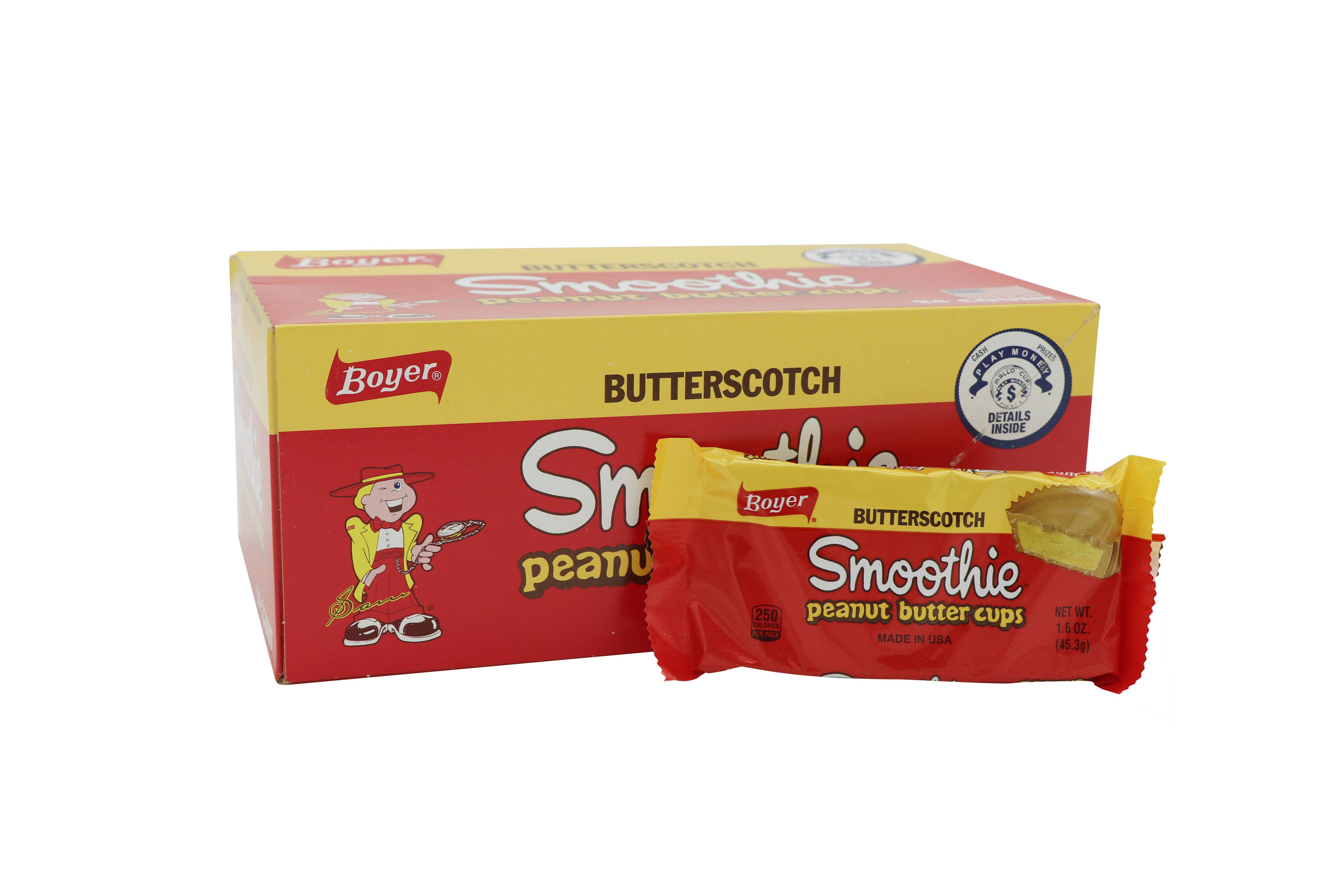 Boyer Peanut Butter Smoothie.   You like peanut butter cups? Great. Now imagine if they took a tropical vacation, got sun-kissed by butterscotch, and came back smooth as ever. That’s Boyer Peanut Butter Smoothie Cups.