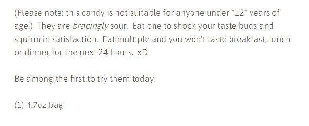 (Please note: this candy is not suitable for anyone under *12* years of age.) They are bracingly sour. Eat one to shock your taste buds and squirm in satisfaction. Eat multiple and you won't taste breakfast, lunch or dinner for the next 24 hours. xD